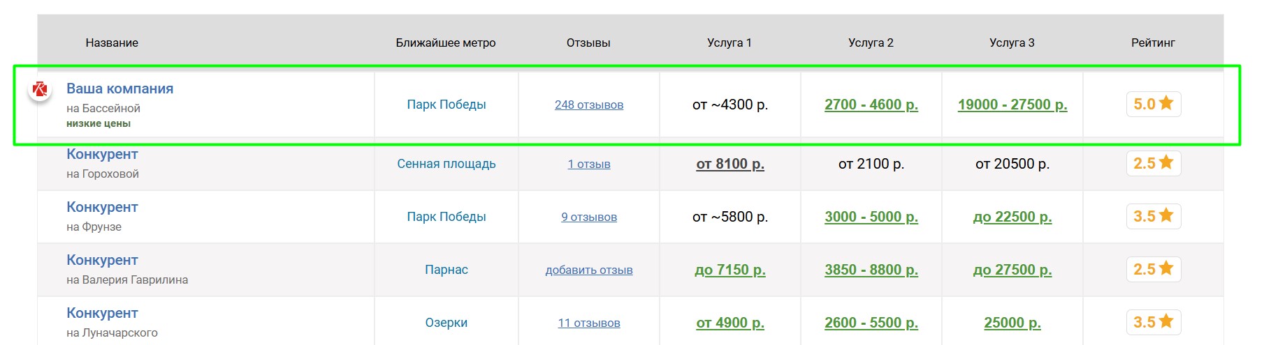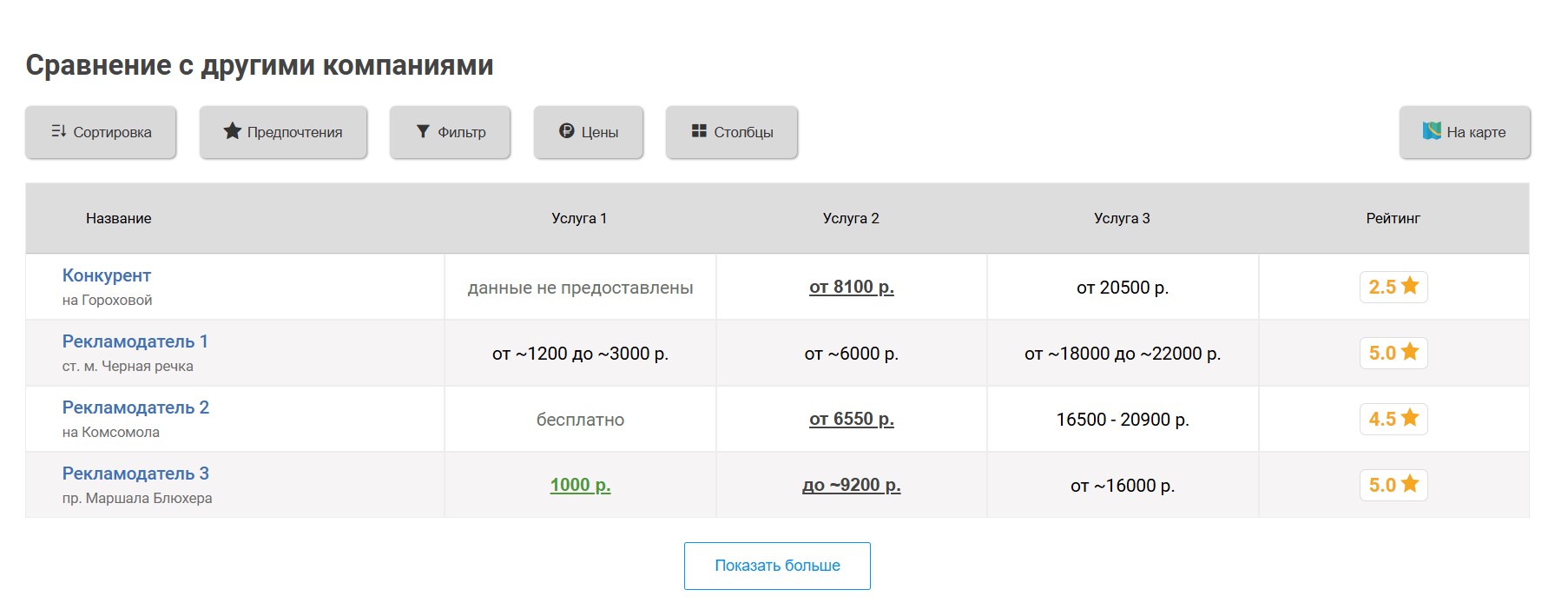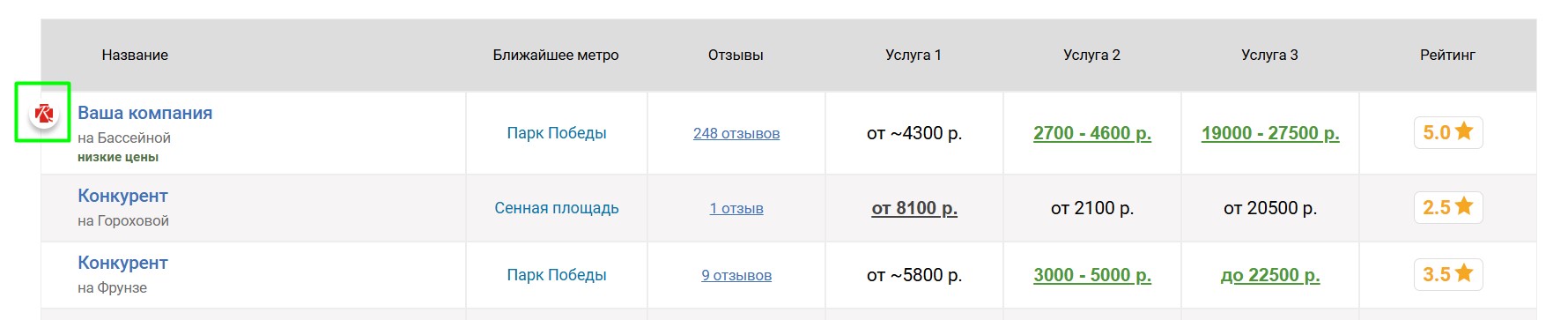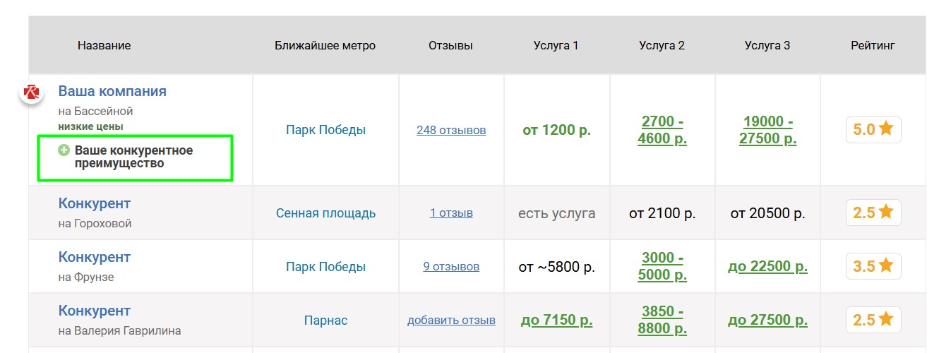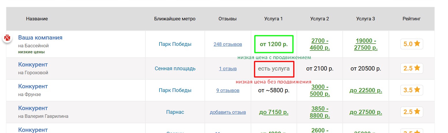 Вокруг продвигаемого таким образом мотосервиса выбирается некоторое количество ближайших конкурирующих мотосервисов, продвигаемый мотосервис попадёт к ним в таблицу «Сравнение по ценам», которая выглядит следующим образом: